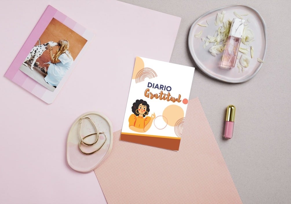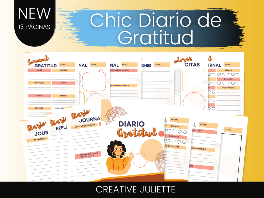 Un super lindo y chic diario de gratitud. Viene con un moderno y femenino diseño. Este planificador no tiene fecha, así lo podrás usar una y otra vez. Hay un lugar para tus citas inspiradoras, y una página de tablero de gratitud lindo junto con páginas diarias y más.